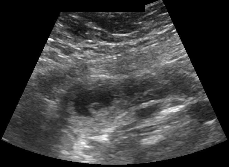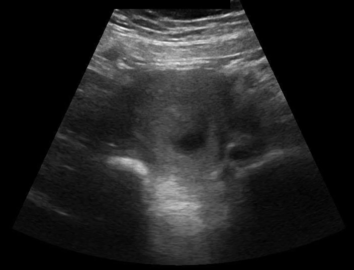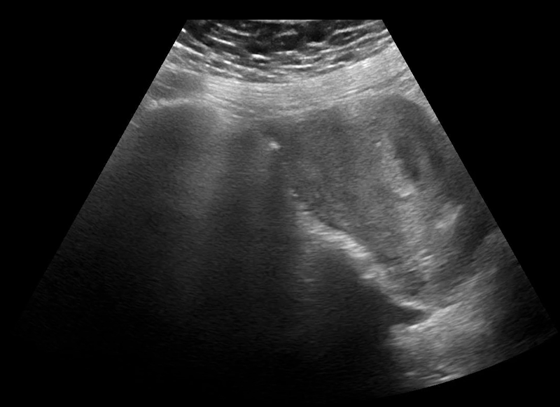 Image 2: Transverse view of the pelvis with possible gestational sac without a yolk sac, so no intrauterine pregnancy. At the end of the clip a very concerning left adnexal structure comes into view briefly.