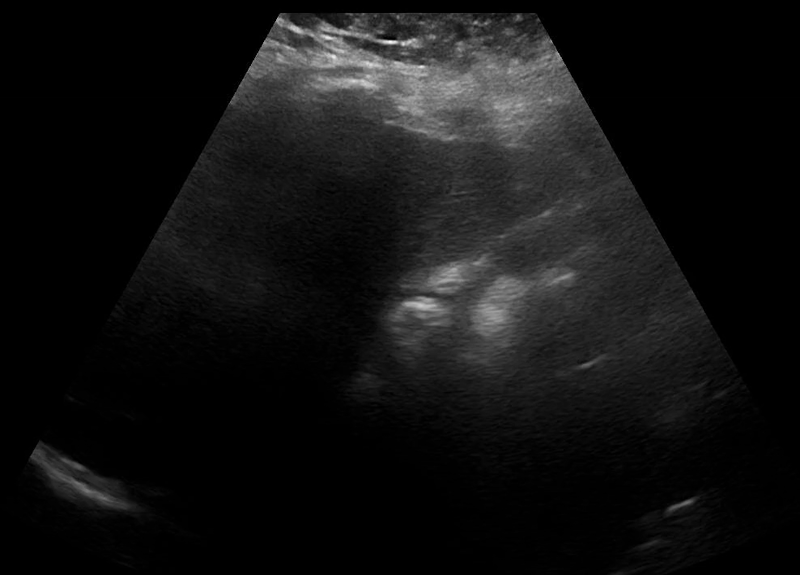 POCUS transabdominal revealed no free fluid in hepatorenal space (image 1), and the uterus without an intrauterine pregnancy (image 2) but with pelvic free fluid (image 3). The left adnexa revealed a gestational sac with a yolk sac (image 4), diagnostic for an ectopic gestation.